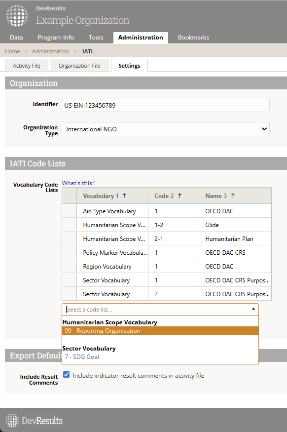 As a result, when setting up your DevResults site for IATI reporting, you'll need to choose which vocabulary you'd like to use eveywhere that IATI provides an option.